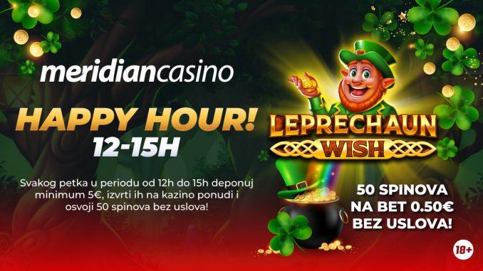 Petak je dan za vrhunsku zabavu i sjajne poklone! U Meridian casinu te svakog petka od 12h do 15h čeka Happy Hour promocija uz čak 50 besplatnih spinova na popularnoj igri Leprechaun Wish od provajdera Expanse Studios.