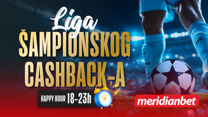 Meridianbet donosi jedinstvenu priliku za sve ljubitelje fudbala tokom utakmica Lige šampiona. U periodu od 18h do 23h, iskoristite promociju “Happy Hour” i uživajte u 100% cashback ponudi!